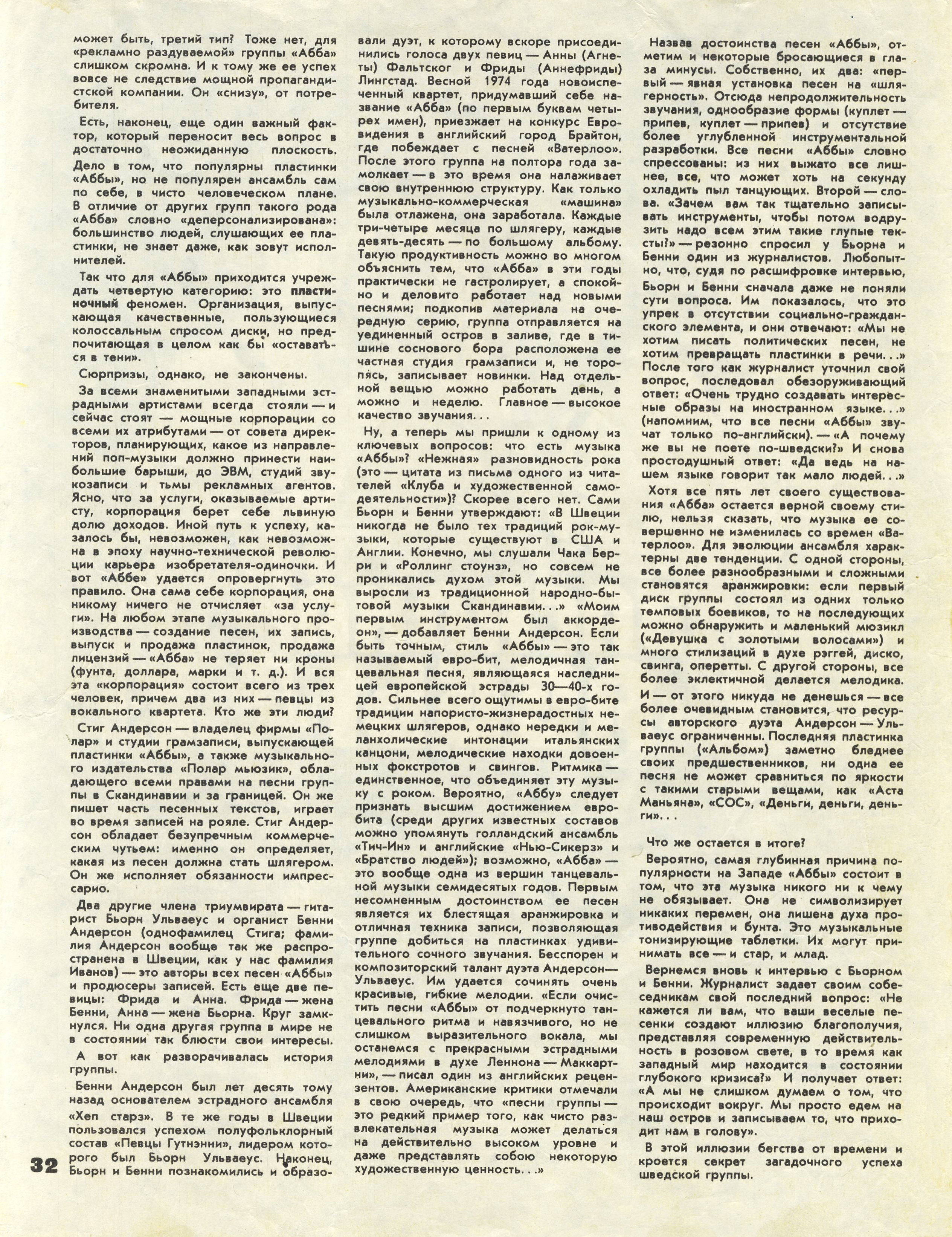 Эта статья, опубликованная в рубрике "ВИА-мастерская", рассказывает о группе "АББА", но в ней упоминается ансамбль "Битлз", указанный как «Битлс», и творческий дуэт Леннон-Маккартни (страница 31, третья колонка, второй абзац сверху; страница 32, вторая колонка, первый абзац снизу).